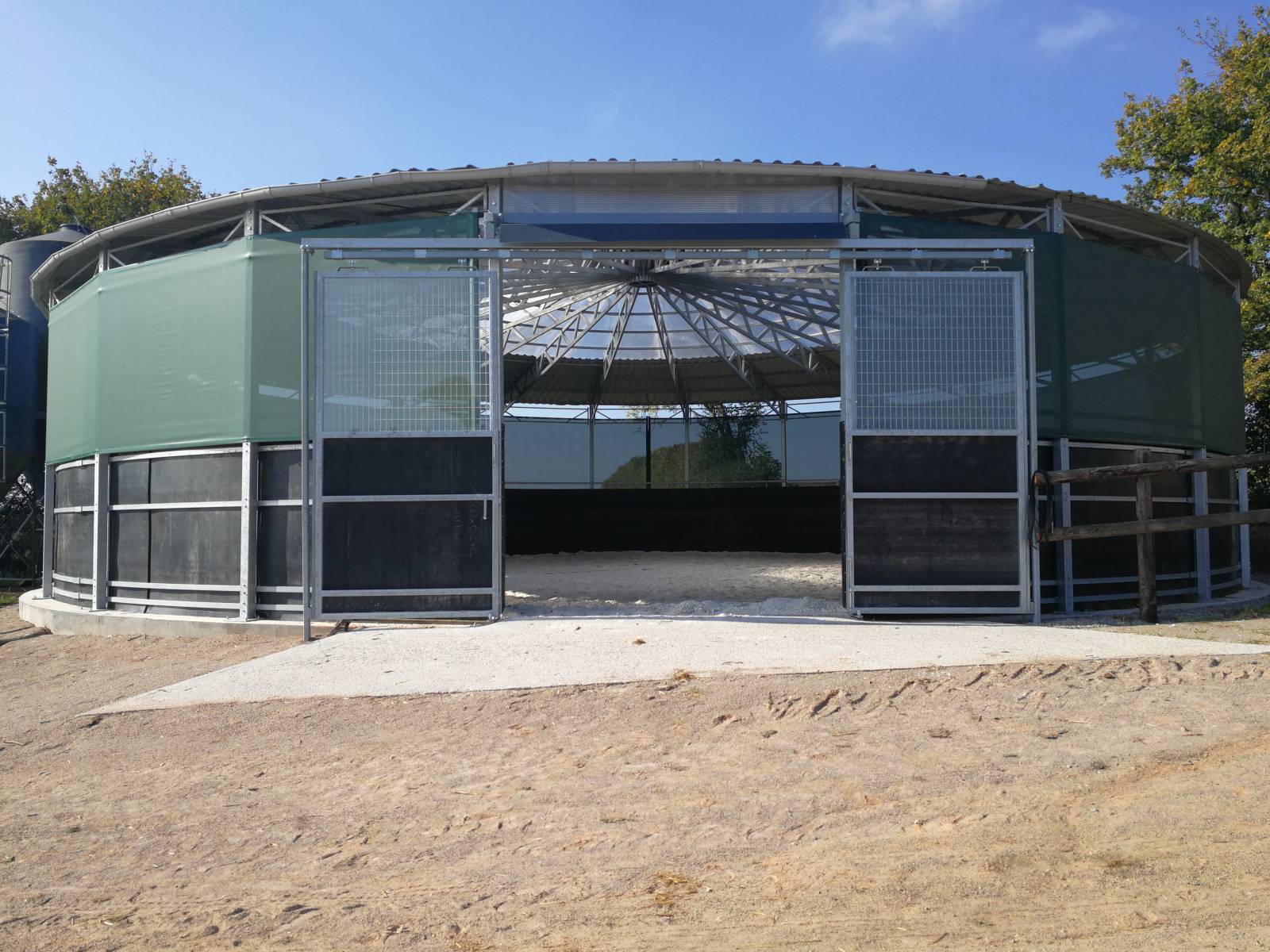 - Toiture en 2 parties : bac acier sur 3.5 mètres en périphérie et partie centrale en polycarbonate translucide adapté. Ce procédé permet d'obtenir un grande surface lumineuse appréciable même par temps gris. L'ensemble couvert forme un batiment circulaire dont la toiture discrete permet une bonne intégration (coloris au choix)